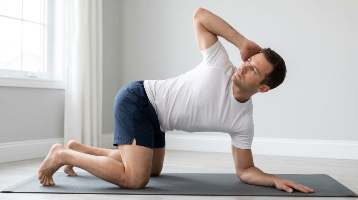 2. Thoracic Spine Rotation – 8 reps each side (2.5 minutes)
